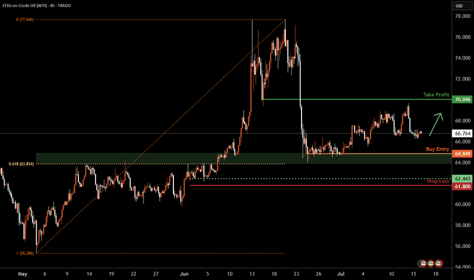 Buy entry is at 64.84 which is a multi-swing-low support that aligns closely with the 61.8% Fibonacci retracement.