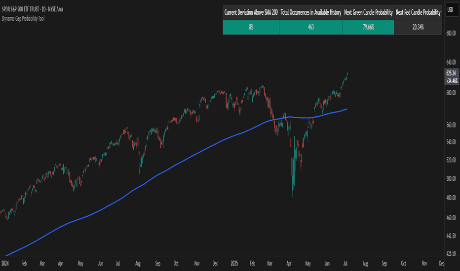 Dynamic Gap Probability ToolDynamic Gap Probability Tool measures the percentage gap between price and a chosen moving average, then analyzes your chart history to estimate the likelihood of the next candle moving up or down. It dynamically adjusts its sample size to ensure statistical robustness while focusing on the exact de