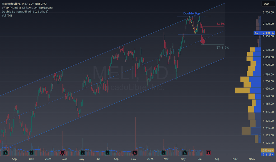 Double Top in MELI – Potential Reversal Inside a Channel🧠 Double Top in MELI – Potential Reversal Inside a Channel