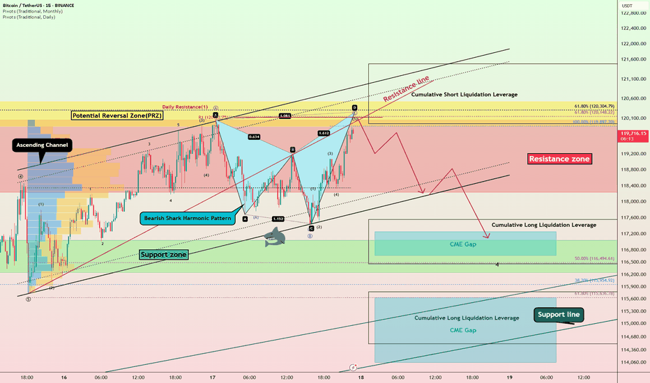Bitcoin ( BINANCE:BTCUSDT ) is currently trading in the Resistance zone($120,100-$118,240) near the Potential Reversal Zone(PRZ) and Cumulative Short Liquidation Le