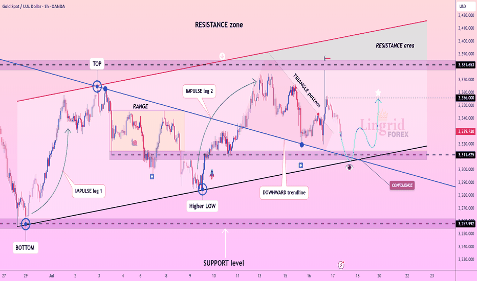 Lingrid | GOLD Continues to See Range-Bound MovementOANDA:XAUUSD is forming a bullish structure above the confluence of the downward trendline and horizontal support at 3,310. A strong impulse move followed by a triangle consolidation hints at an emerging continuation pattern, with buyers preparing for another leg higher. Price is currently approach