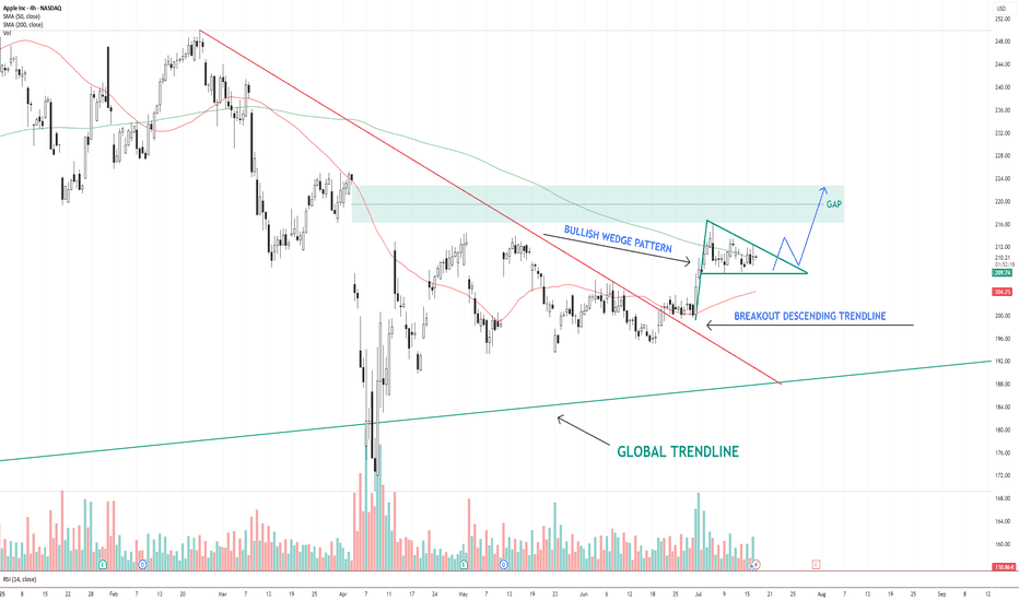 AAPL – Bullish Wedge Breakout Setup Toward Gap FillAAPL NASDAQ:AAPL has broken out of a descending trendline and is now consolidating inside a bullish wedge pattern . Price is holding above the 200 SMA and hovering near the 50 SMA.