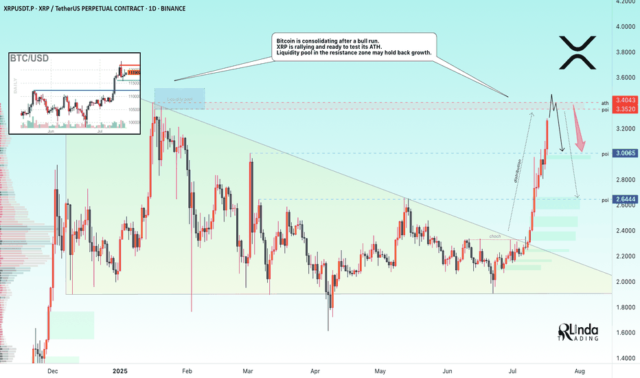 XRP → ATH retest. Reversal or continued growth?BINANCE:XRPUSDT.P is rallying and ready to test the resistance zone - ATH. Against this backdrop, Bitcoin is consolidating after a bull run. The liquidity pool may hold back growth.